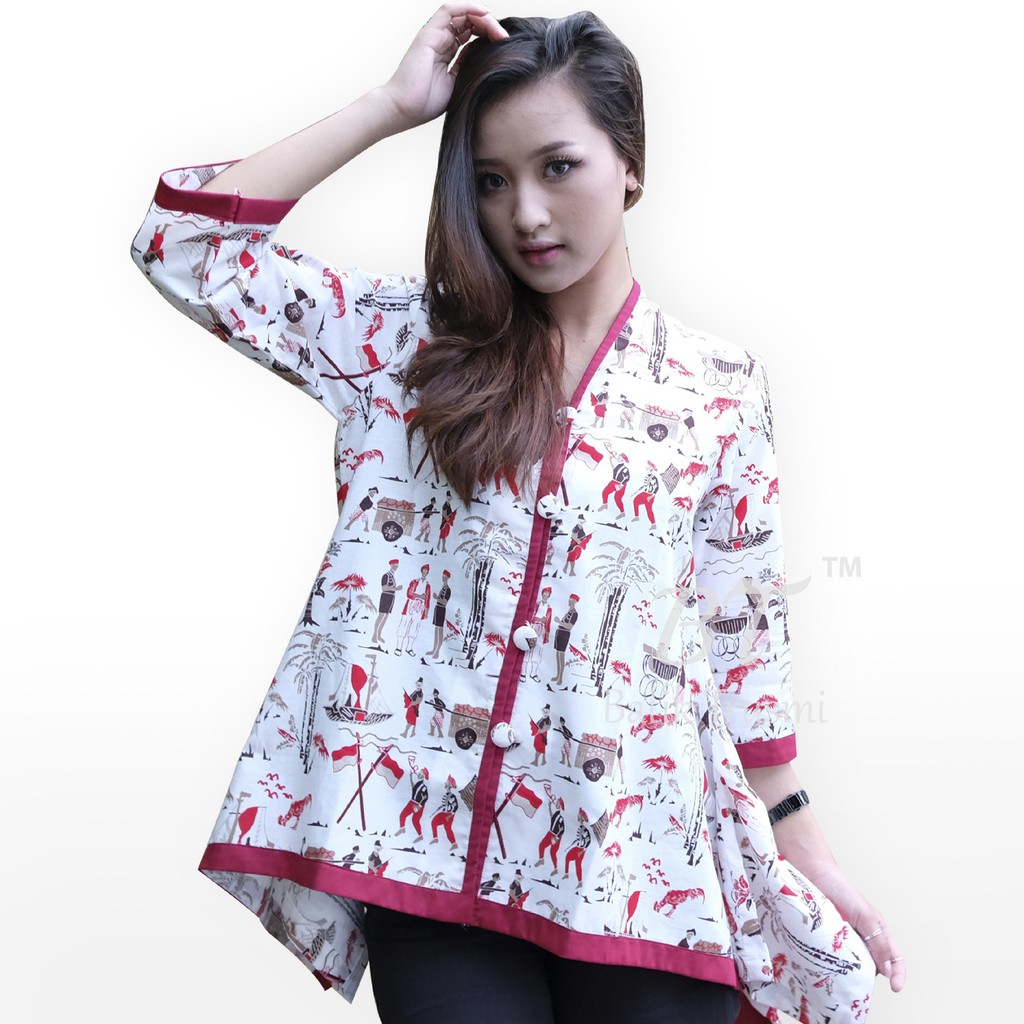 BLOUSE BAMBOE ROENTJING adalah Blouse yang diproduksi dengan motif spesial. Diproduksi terbatas dengan warna dasar putih corak merah, motif batik bertemakan perjuangan masyarakat Indonesia saat melawan penjajah bakal bikin tampilanmu makin keren !!
